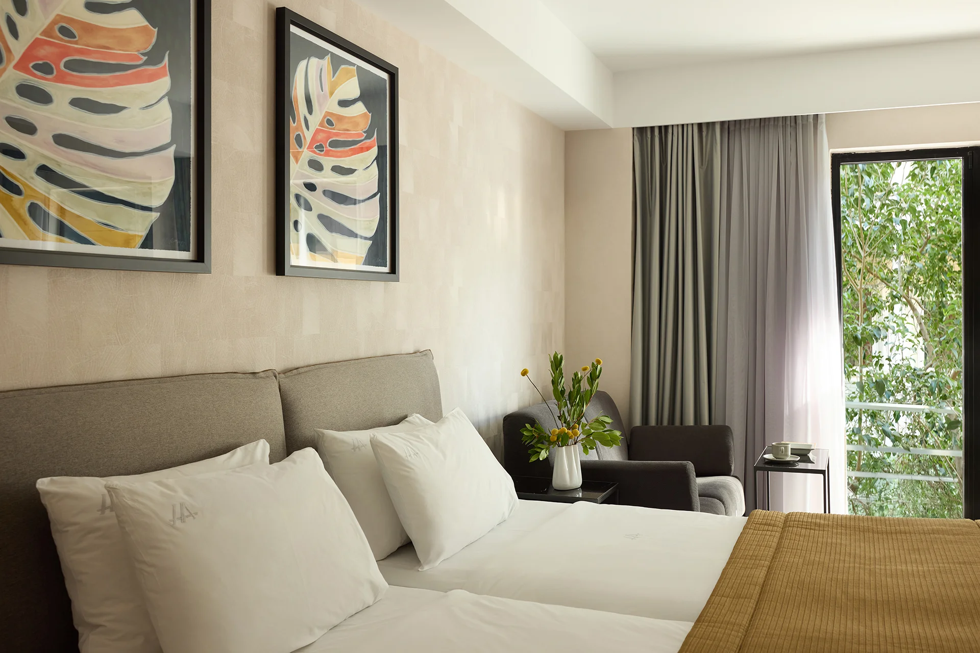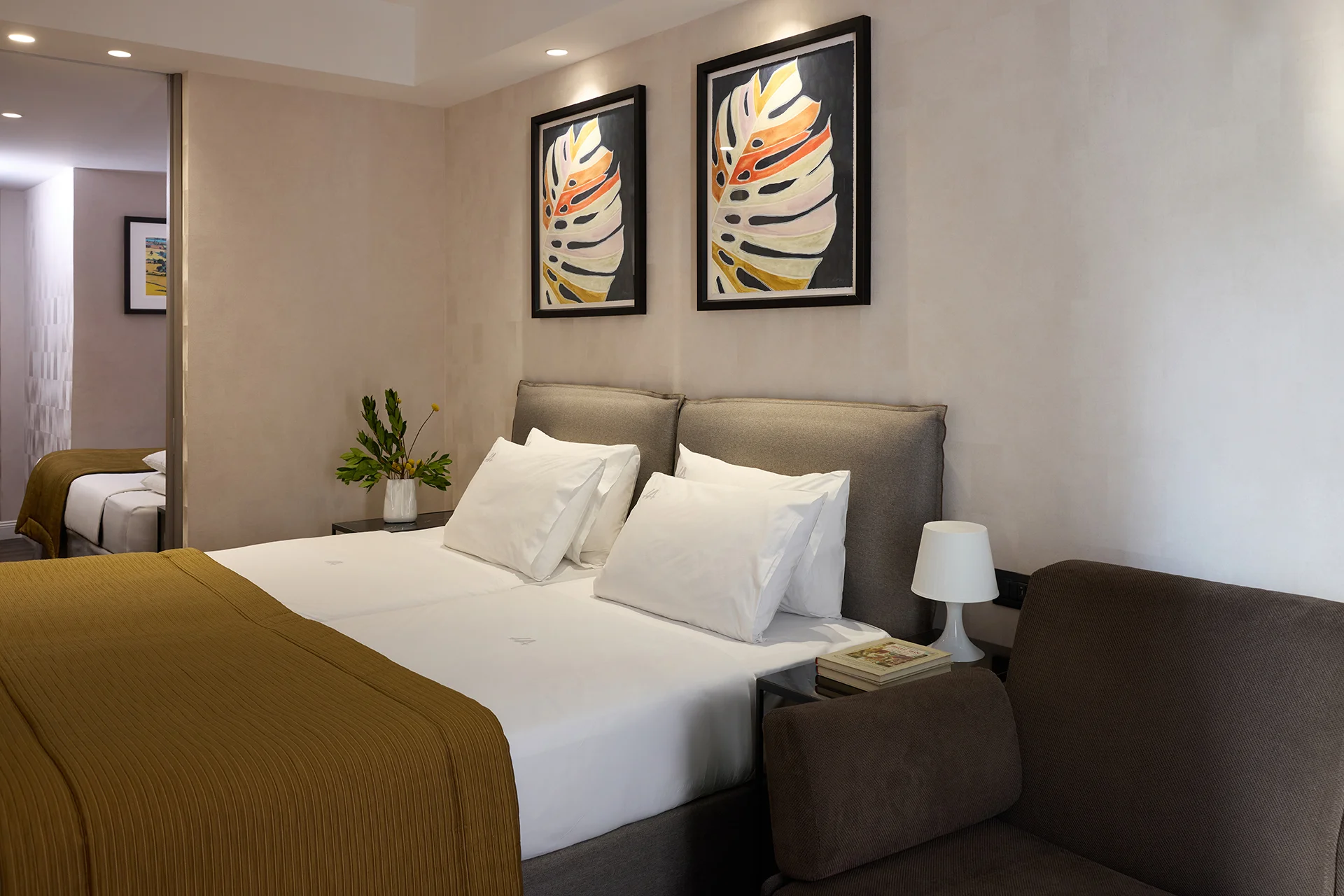 Ideal for larger groups or a family, our Family Room (40 sqm) can accommodate up to 4 guests in utter comfort. The intelligent interior design meets the gracious decor in a spacious room that is crafted to host you in an uncluttered space, where you can retain your privacy and exclusivity. You will have at your disposal 3 beds of 100 cm width and one 100 cm wide sofa bed, a luxurious bathroom with shower, and a smaller WC. Naturally, your stay includes our full list of amenities such as: a Nespresso coffee machine, free high-speed Wifi, 2 a flat-screen satellite TVs 50”, iron & ironing board and many more.